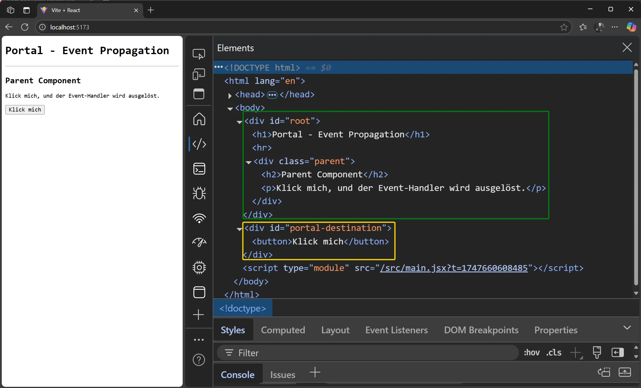Wenn wir nun auf das Component <div class="parent">...</div> oder auf den Button “Klick mich” drauf klicken, wird jedes Mal ein Log in der Konsole erzeugt, also in beiden Fällen die Funktion handleClick() ausgeführt.