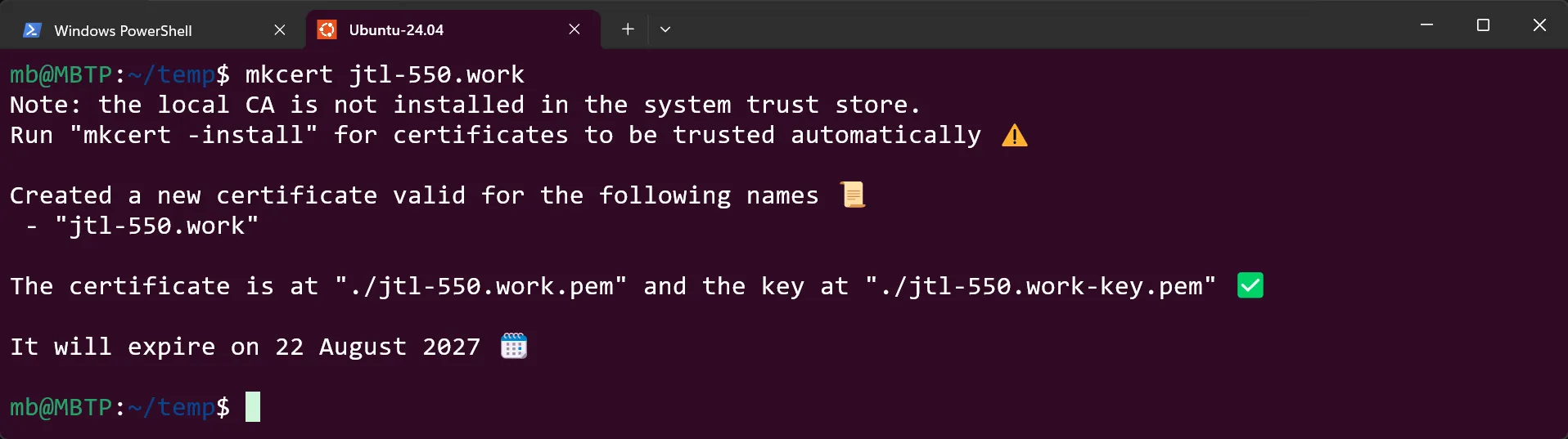 mkcert jtl-550.workDabei erhalten wir folgende Ausgabe, wenn alles korrekt funktionierte.